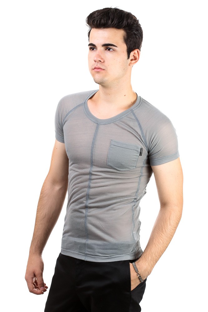 Простой крой этой футболки компенсируется ярким синим цветом, интересными швами и накладным карманом на груди. Лучше сочетать такую модель с низом приглушенного цвета - темных или пастельных тонов.