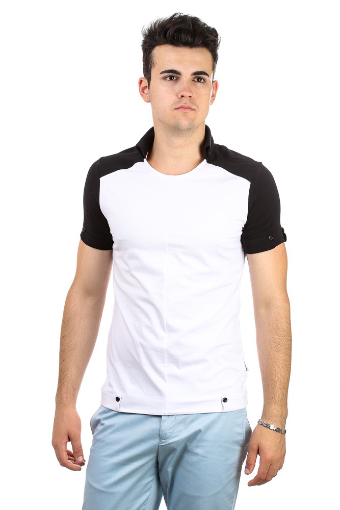 Эта футболка хороша всем: и оригинальным воротником-стойкой, и интересным сочетанием цветов, и стильными деталями. Советуем поторопиться, эта модель точно не задержится долго на нашем складе! :)