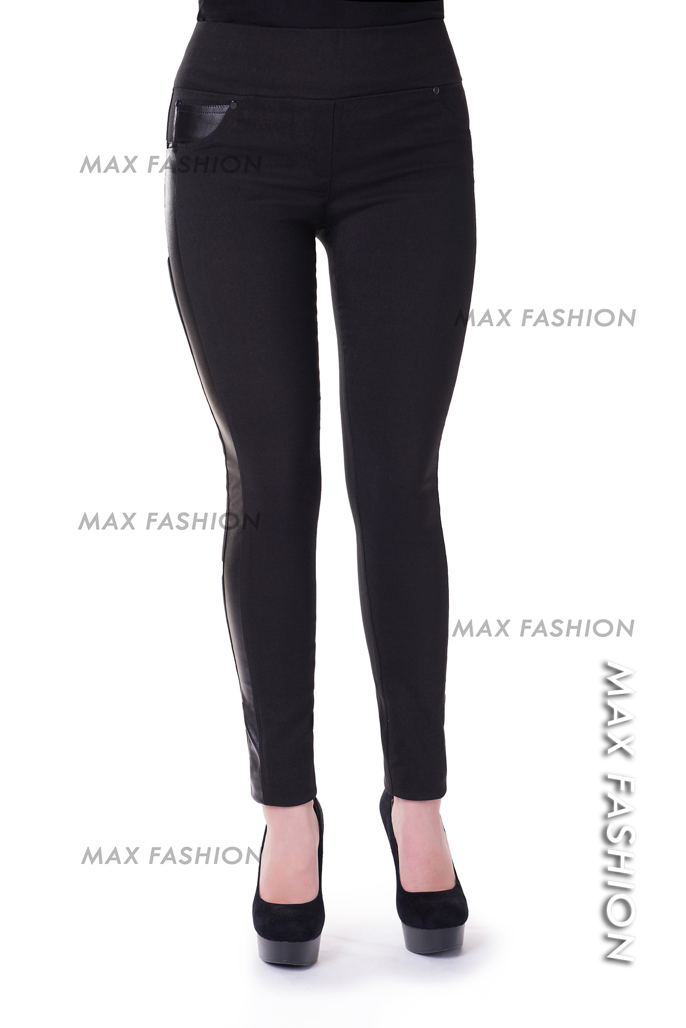 Женские модные черные брюки -- лосины с вставками из искусственной кожи.